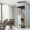 Stiltz Trio+ is a free-standing, self-supporting lift with no visible hoist and no noisy motor. It offers quiet travel, fast installation, and is designed for larger spaces, including wheelchair access.